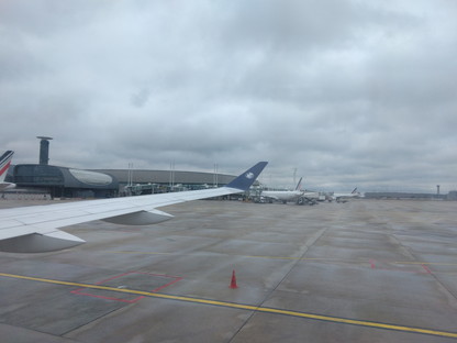 夜はフランス出張のために羽田空港に行き、搭乗チェックインして出国手続きをしてラウンジに行って時間まで仕事をしてから1:00am発の飛行機に乗りました。ロシアの上空は飛ばないようにアラスカ・北極・グリーンランドを13時間飛んで乗り継ぎのパリのシャルルドゴール空港に到着しました。フライトでは学生の論文チェックをして、寝不足と時間帯が夜というのもあって半分以上寝ることができて有意義でした。