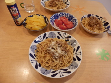 夕食はボロネーゼ風パスタを食べました。広島で買ってきたお好み焼きソースとケチャップを使ったらいい味になりました。