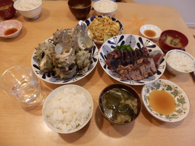 夕食はカツオの藁焼きとサザエのつぼ焼きを食べました。