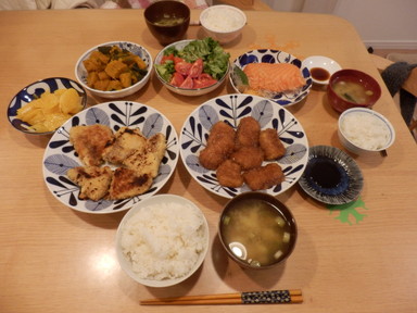 夕食はサーモンの刺身とカジキフライといかカツを食べました。