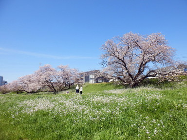 そして、多摩川まで歩き、河川敷を30分ほど歩いて堤防の桜を見ながら大学に向かいました(雨の合間で今日だけ天気が良さそうだから、ラーメンを食べてここを歩くために午前は家で仕事して時間調整した)。この道は空いていて広々として気持ちいいです。菜の花、ハナニラ、タンポポなどもすごく綺麗でした。