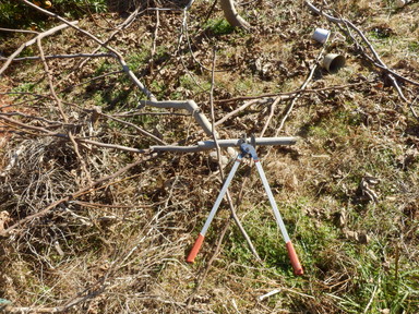 昼食後は買い物に行き、午後はずっと畑仕事をしました。チェーンソーで剪定された大きな枝をのこぎりなどでカットしました。今回はハサミのような新兵器が導入されて、のこぎりよりもさらに効率アップしました。そして、塀沿いの蔦植物の除去作業をしました。