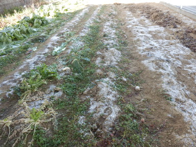 昨日は雪が少し降ったようで、畑の日陰には雪が残っていました。