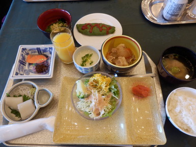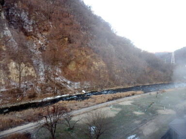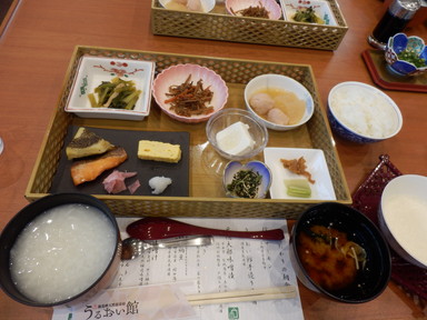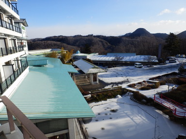 朝起きて窓の外を見ると少し雪が積もっていました。朝食を食べ、温泉に入りました。