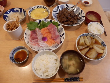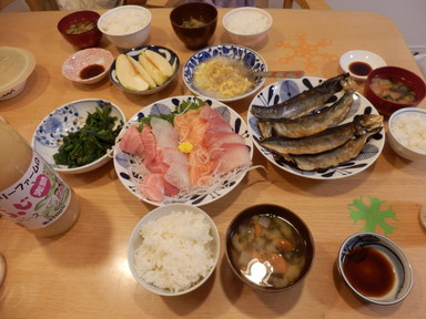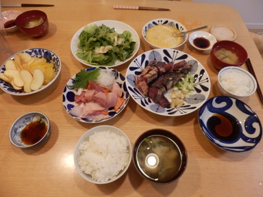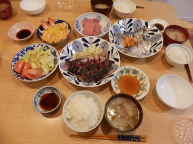 夕食はまぐろの刺身としめ鯖とカツオのたたきを食べました。