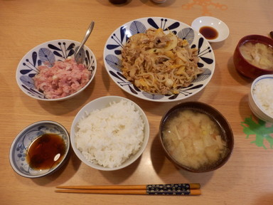 夕食は牛肉とごぼう煮とまぐろの刺身とさつま揚げを食べました。