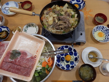夕食は、スーパーで見切り品のねぎが売られていて、その形を見てすぐに下仁田ねぎだと分かって(先週の下仁田のねぎ畑の写真)買って帰り、豚すき焼きを食べました。