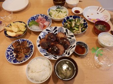 夕食はハンバーグと刺身を食べました。今はねぎが旬でスーパーで激安です。