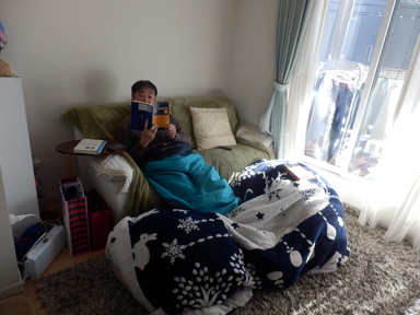 今日は家で仕事をしました。午前はパソコンがある部屋は寒いから、普段は子供が使っていて使えない日が当たるソファーで寝袋を履いて教科書を読んで勉強しました。