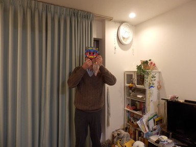 節分だから、食後は豆まきをしました。ただ、まくと豆がどこかに飛んで行って見つからなくなるから、豆は撒かないで食べました。