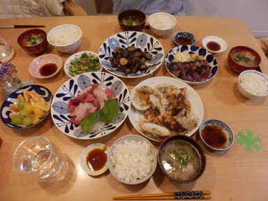 夕食は刺身と餃子を食べました。