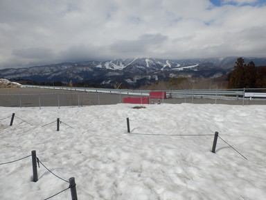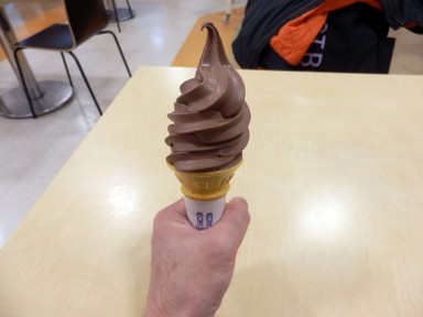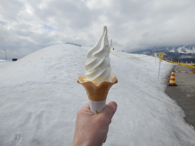 名古屋に来て、そのまま帰るというのも新しい知見が得られないから、どこかいいところがないかと探し、白川郷に寄って帰ることにして、朝はバスで名古屋駅に行きました。ナナちゃん人形前の名鉄バスセンターから高速バスに乗って白川郷に向かいました。途中のひるがの高原SAで休憩したとき、ソフトクリームを食べました。この辺りから雪景色になってきました。