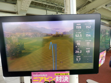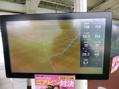 このゴルフ練習場では打球を計測するすごいシステムがありました。カメラがいろいろな場所にあるようで、打球の飛跡をモニターで確認できるようになっていました。打ったら球がどこに行ったか見えないから、これは面白いです。