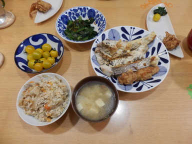 夕食は炊き込みご飯と鯛の塩焼きを食べました。
