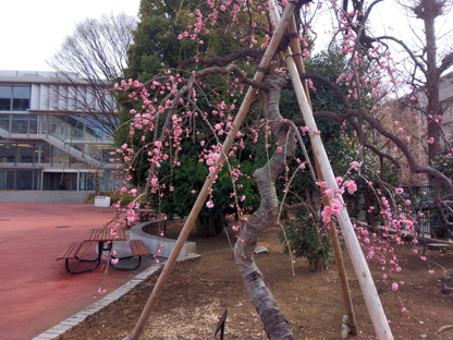 大学の枝垂桜が咲き始めていました。