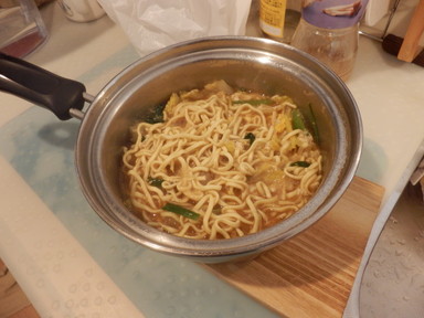 昼食はインスタントラーメンを(鍋のまま)食べました。