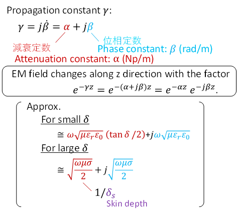 複素誘電率:誘電率に少し導電率がある場合、導電率の影響を考慮するために誘電率を複素数に拡張して、導電率が0の場合の定式化を利用して伝搬、減衰などの各種特性を計算する。本ページの下部の計算の詳細を見ればその意味は明解である。
